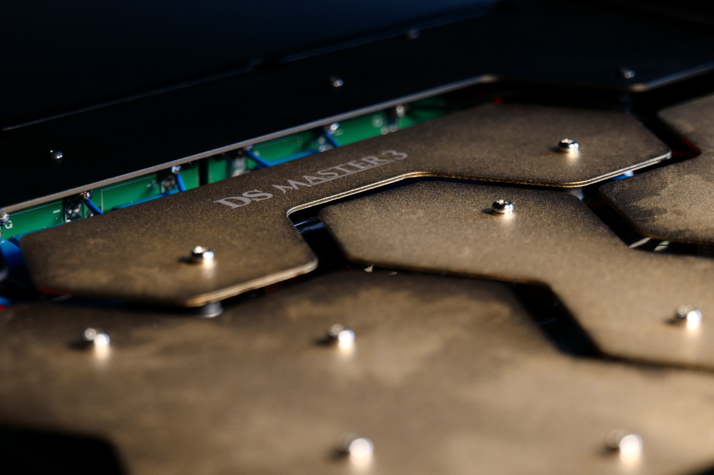 Der DS Master3-Equalizer verfügt über ein duales monaurales Schaltungsdesign mit drei Transformatoren und völlig unabhängigen Schaltungen für rechts und links. Die Stromversorgung wurde erheblich verstärkt, so werden besonders die tiefen Frequenzen mit noch mehr Ausdruck, Natürlichkeit und Ruhe wiedergegeben. Der DS Master3-Equalizer verfügt über symmetrische und unsymmetrische Ausgänge, und die Cutoff-Frequenz der tiefen Frequenzen kann aus sechs verschiedenen Optionen ausgewählt werden.
