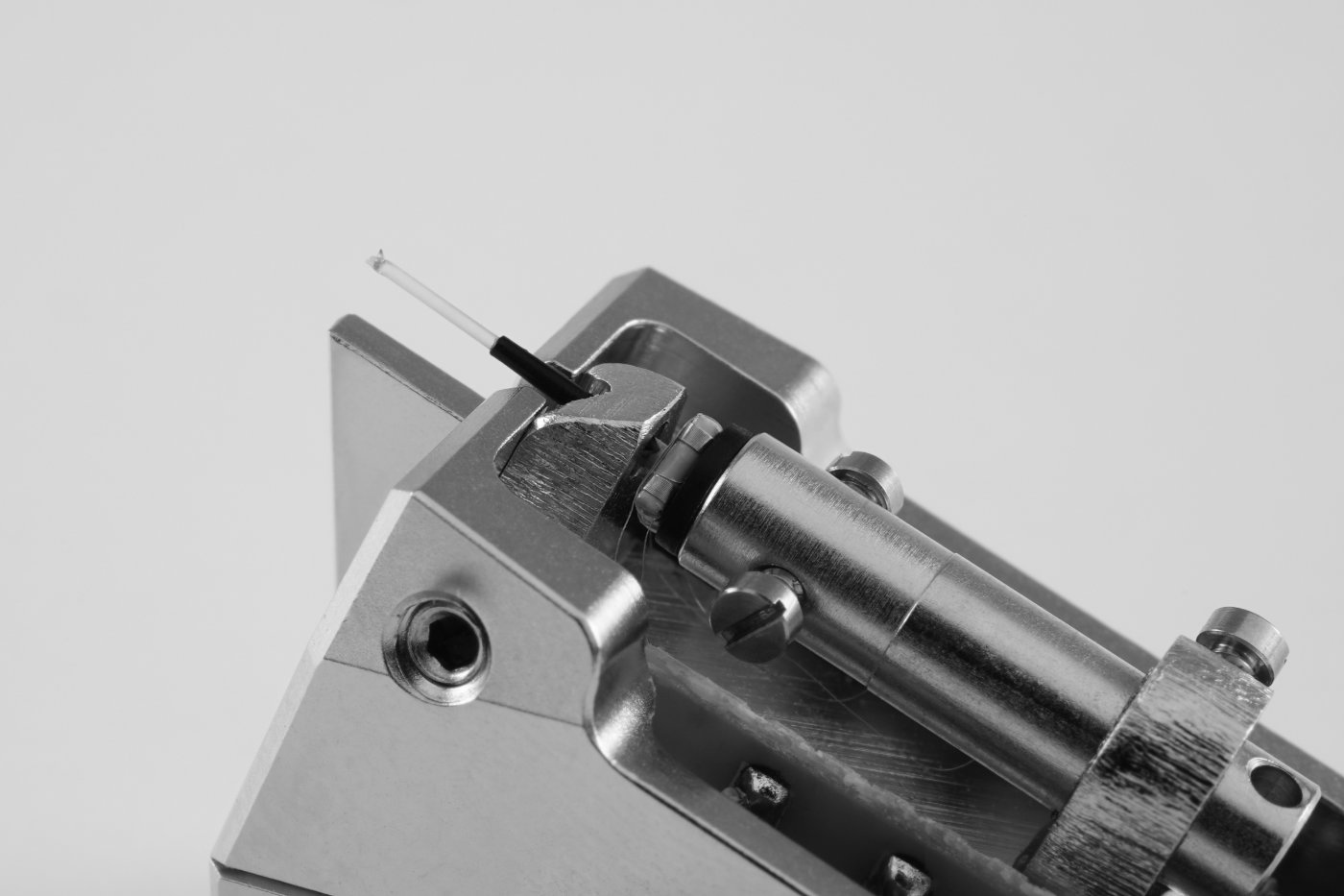Ein weiteres Highlight ist der Nadelträger aus Saphir und Titan. Der schon aus dem EMT Pure Black und VM bekannte Saphir-Nadelträger ist hier zusätzlich in ein Röhrchen aus Titan eingelassen, und dieses ist bombenfest und resonanzarm mit dem neuen Mehrschicht-Spulenkörper verbunden.Abtastdiamant im Nadelträger eingelassen