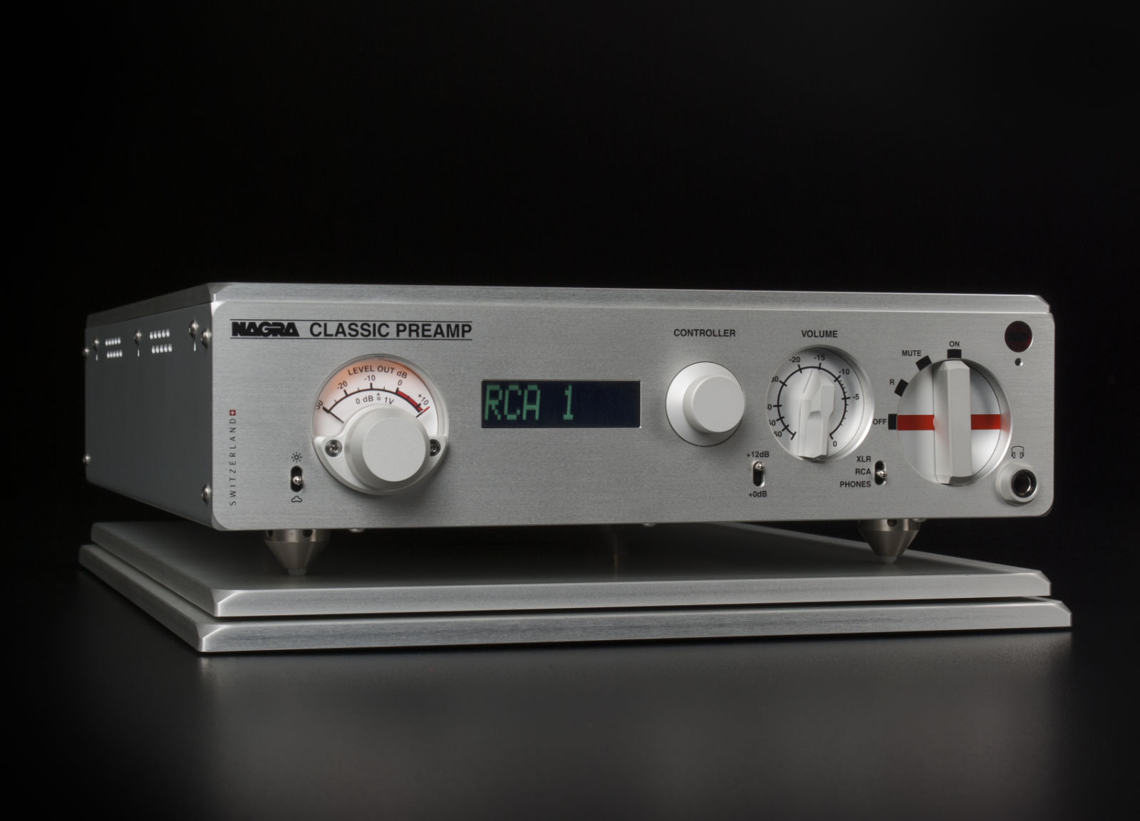 Die Ausgangsspannung wird vom bekannten Nagra Modulometer angezeigt – eine Reminiszenz an die klassischen Nagra-Bandmaschinen. Sie kann über einen Schalter zwischen 0 und 12 db angepasst werden. Das Signal kann wahlweise symmetrisch mit XLR oder assymmetrisch via Cinch ausgegeben werden. Optionale, klangsteigernde Ein- und Ausgangsübetrager stehen für einen echten trafosymmetrischen Betrieb zur Verfügung. Für den Kopfhörerbetrieb wird der gleiche Verstärker wie beim Classic DAC eingesetzt (!). Auch hier alles auf höchstem Niveau. Selbst an die Integration des Classic Preamp in eine Heimkinoanlage wurde gedacht. Einer der Eingänge kann durchgeschaltet werden.
