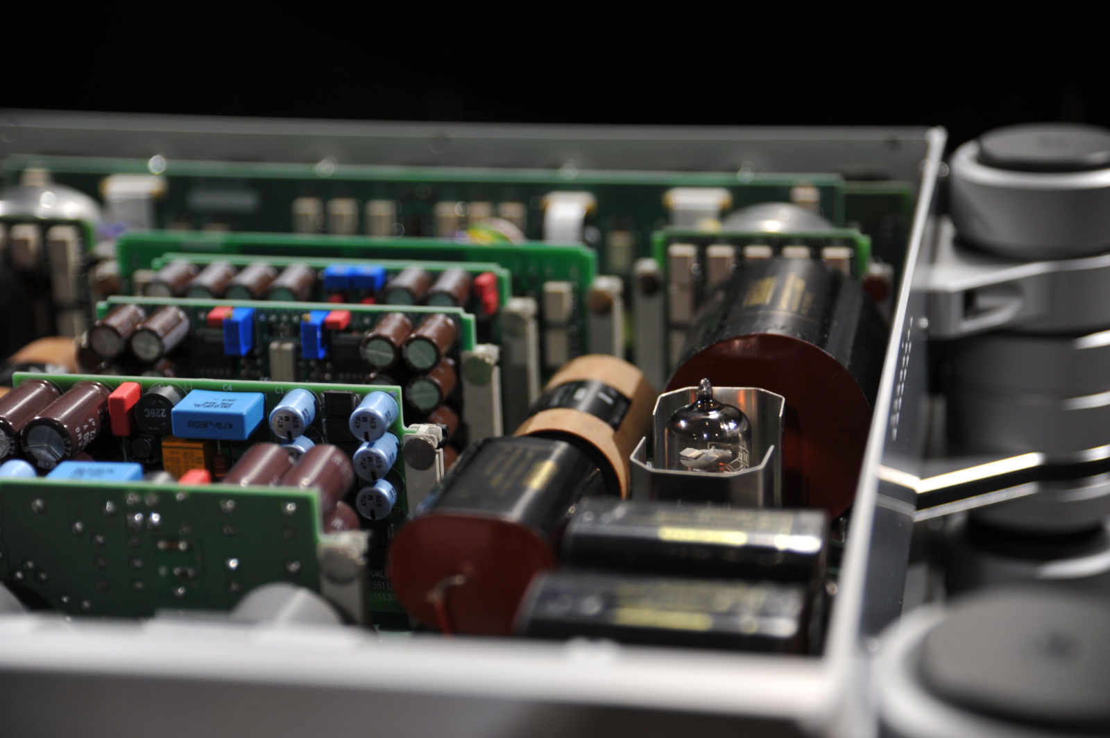 Um Mikrophonie und damit negative Einflüsse auf das Klangbild schon beim Entstehen zu bekämpfen, stehen Vorstufe und Stromversorgung auf speziell konstruierten, mit dem Gehäuse fest verschraubten und auf das Gerät exakt abgestimmten Entkopplungselementen.