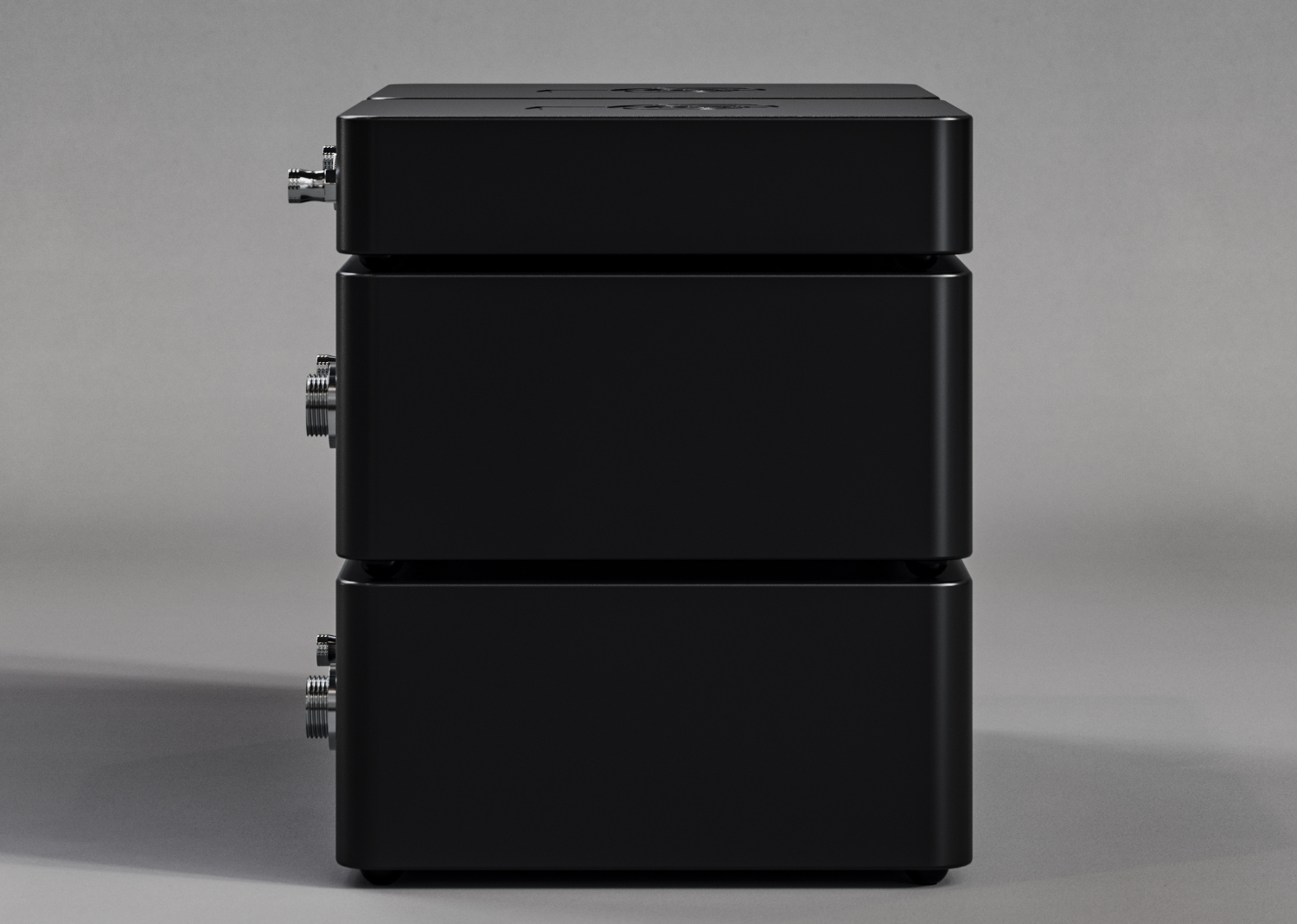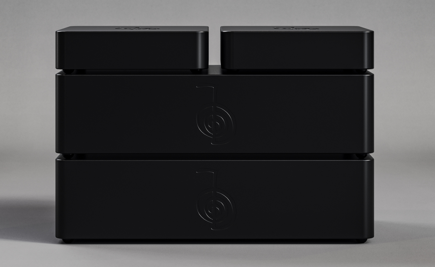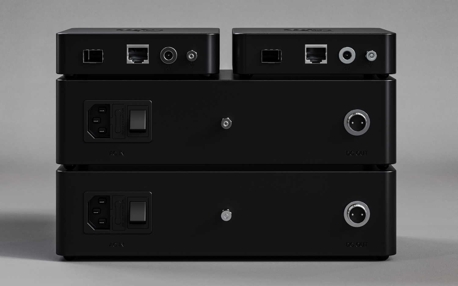 In der Praxis ist es am besten, die beiden PRO-Netzteile nicht wie gezeigt übereinander zu stapeln, da die Isolationsfüße der unteren Einheit zu stark komprimiert werden könnten. Es ist absolut in Ordnung, eines oder beide OpticalBridge-Geräte auf einem der PRO-Netzteile zu installieren, da es sich um wesentlich leichtere Geräte handelt.