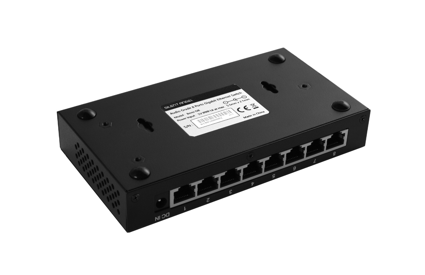 Der Silent Angel Bonn N8 besticht durch minimales elektrisches Rauschen und herausragende Störfestigkeit. Er gewährleistet einen verlustfreien Datentransfer und sichert die Übertragung von erstklassigen Netzwerksignalen. Auf der Rückseite bietet er acht Gigabit-Anschlüsse, perfekt für Ihre Audiogeräte und alle weiteren Komponenten Ihres Heimnetzwerks.