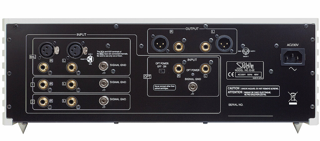 Der Soulnote E-2 verfügt über vier Eingänge, die jeweils einzeln schaltbar sind. Umfangreiche Möglichkeiten der Anpassung bis hin zur genauen Justage von verschiedensten Entzerrerkurven machen den Soulnote E-2 zur idealen analogen Schalt- und Klangzentrale für Musikbegeisterte. Eine echte Besonderheit des E-2 ist ein dedizierter Eingang für die Lichttonabnehmer von DS-Audio.