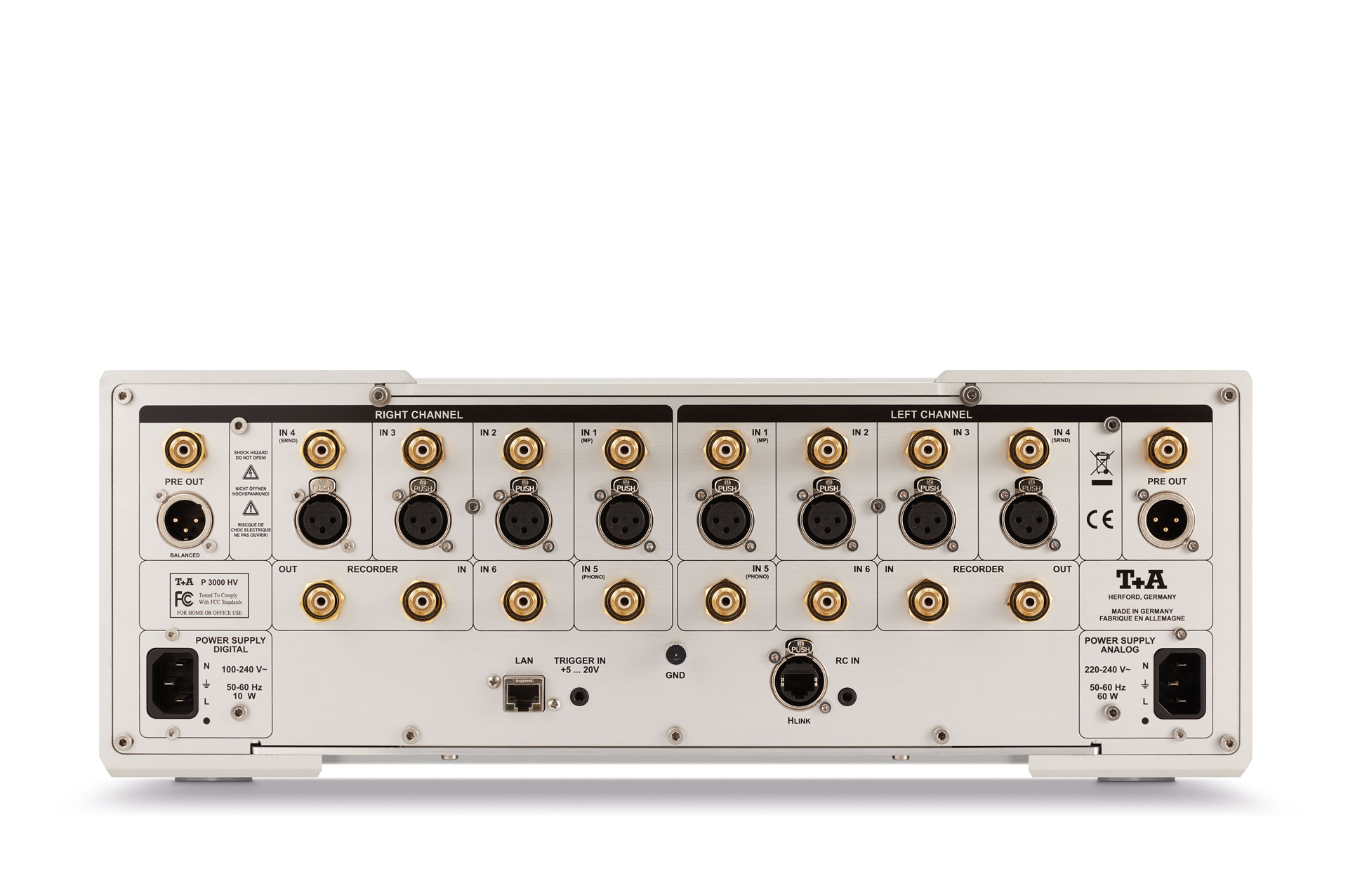Der T+A P 3100 HV ist nicht nur ein hoch-spannendes Gerät mit seinem, für einen Vorverstärker beeindruckenden Gewicht von 28 kg, sondern arbeitet auch mit Hochspannung. Natürlich alles durch entsprechende Schutzschaltungen abgesichert. Durch die hohen Betriebsspannungen wird neben hoher Linearität auch ein extrem großer Dynamikumfang erreicht. Diese einzigartige Technologie hat T+A für alle Geräte der HV-Serie entwickelt. Made in Germany versteht sich.