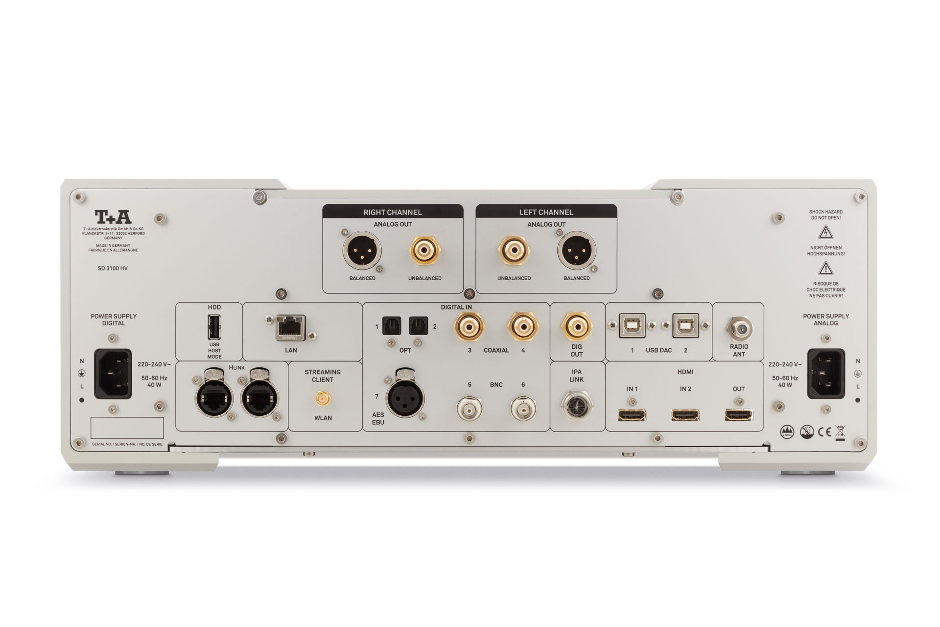 Zur Haptik und Bauqualität des SD 3100 HV muss nicht mehr viel gesagt werden. Die ganze HV-Serie von T+A setzt hier seit Jahren schon Maßstäbe. So sind alle HV-Geräte konsequent ohne ferromagnetische Materialien aus reinem Aluminium aufgebaut und mit Aluminiumtrennwänden abgeteilt. Analog- und Digitalselektion sind konsequent getrennt untergebracht und finden so optimale Betriebsbedingungen. Alles per Fernbedienung oder App steuerbar.